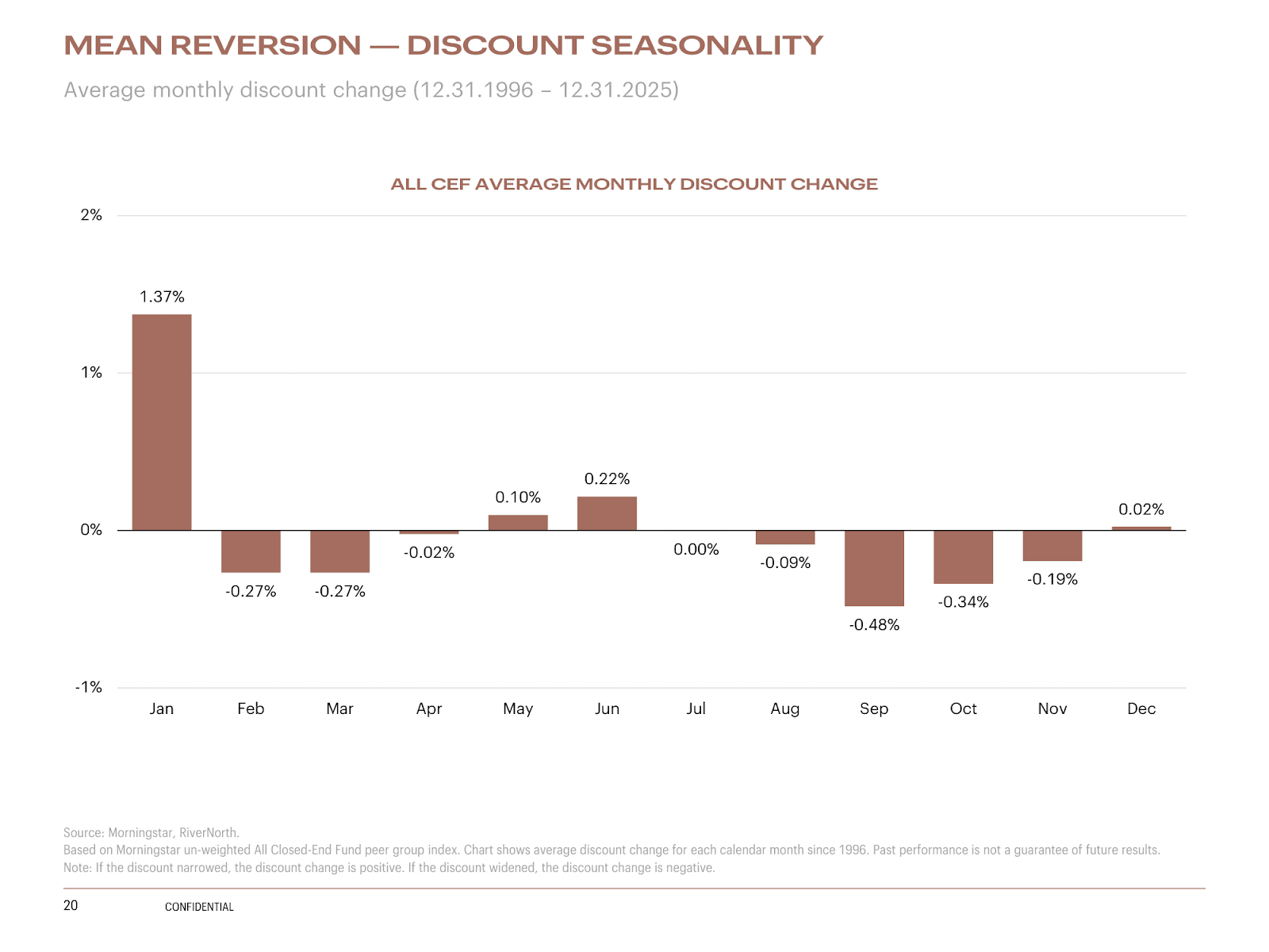 Since 1996, closed-end fund (CEF) discounts have narrowed the most in January compared to every other month.1 This historical pattern, though not a guarantee of future results, is known as the January Effect and happens about 90% of the time.2 It can present an opportunity for investors to benefit from strategically investing in closed-end funds, an investment vehicle that behaves quite differently from your average equity investment. In January 2026, the pattern held as discounts for the All CEF PGI narrowed 59 bps from -5.54% to -4.95%.