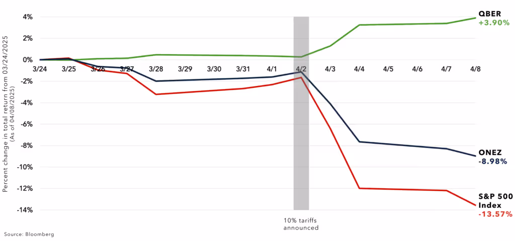Just look at how the Quarterly Bear Hedge ETF (QBER) and the Seasonality Laddered Buffered ETF (ONEZ) performed against the S&P 500 Index as a percentage change from March 24 through April 8.